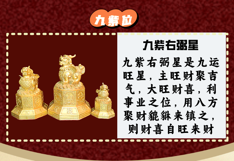 九、 九紫右弼星,这个在现在这个九运是属于吉星,正财星位,可旺财,带来喜庆,婚喜事,生育男丁及旺事业等吉事,可以提升气场更加吉利。