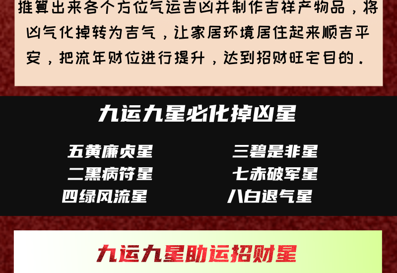 风水是以九星来论,原气运星盘和流年星盘都是需要讲究,我们在生活中,每一年都是会发生一些事情,并不是每年相同,这就是由人的运气和风水的气运气场引起,风水气运气场是由九大行星引动,流年行星引起吉凶更快,所以我们每一个家居阳宅在每年间都是需要调整气场环境来改变凶气,提升吉气,这样也就能让我们居住安吉,工作事业和财运、健康都能得到提升。