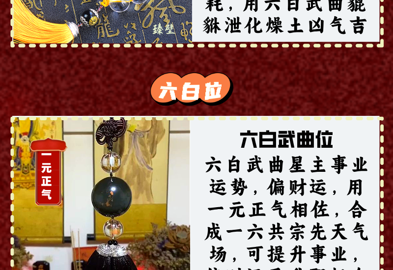 六白武曲星,配一元正气,得一六共宗,加强一方正气,提升偏财运,防止破财耗财。