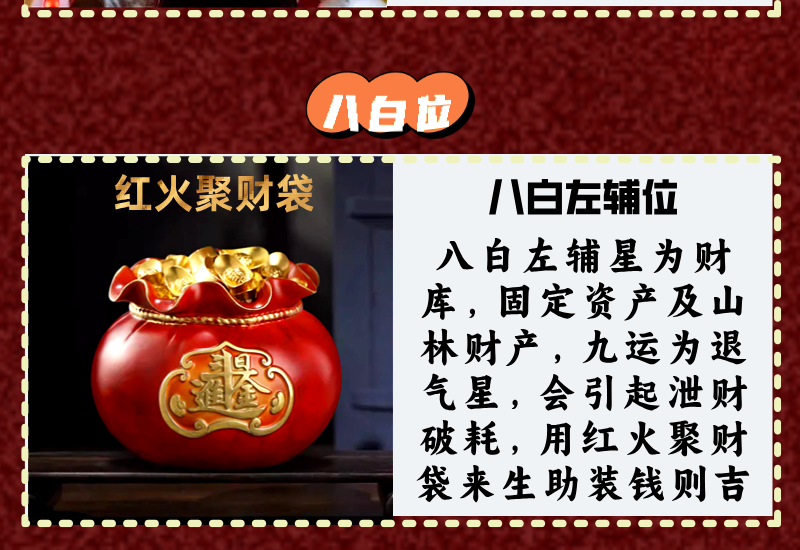 八白左辅星,用昆仑山五色土两份,配合二八合十局,加强八白财库能量,提升聚财护财能量场。